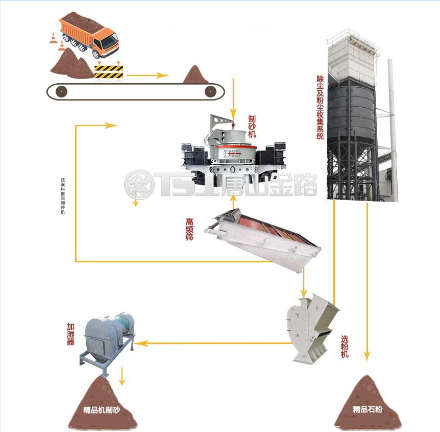 物料首先從原料倉經(jīng)過電子秤進(jìn)入到皮帶輸送機(jī)中,再由提升機(jī)將物料入到制砂機(jī)內(nèi)進(jìn)行破碎處理,破碎后的物料進(jìn)入高頻篩中進(jìn)行篩分,篩分后的較大物料會返回制砂機(jī)內(nèi)進(jìn)行二次破碎,符合要求的砂子則會進(jìn)入選粉機(jī)中進(jìn)行選粉處理,產(chǎn)生的粉塵會經(jīng)由粗細(xì)粉分離機(jī)進(jìn)入到布袋收塵器。最后,篩分選粉合格的產(chǎn)品會進(jìn)入加濕拌合機(jī)進(jìn)行加水處理,防止機(jī)制砂在運(yùn)輸過程中產(chǎn)生離析或揚(yáng)塵。